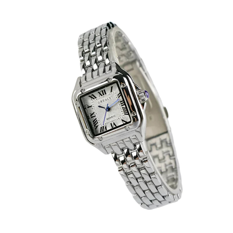 Classic square wristwatch with a silver steel band. Features a minimalist quartz movement design for timeless elegance.